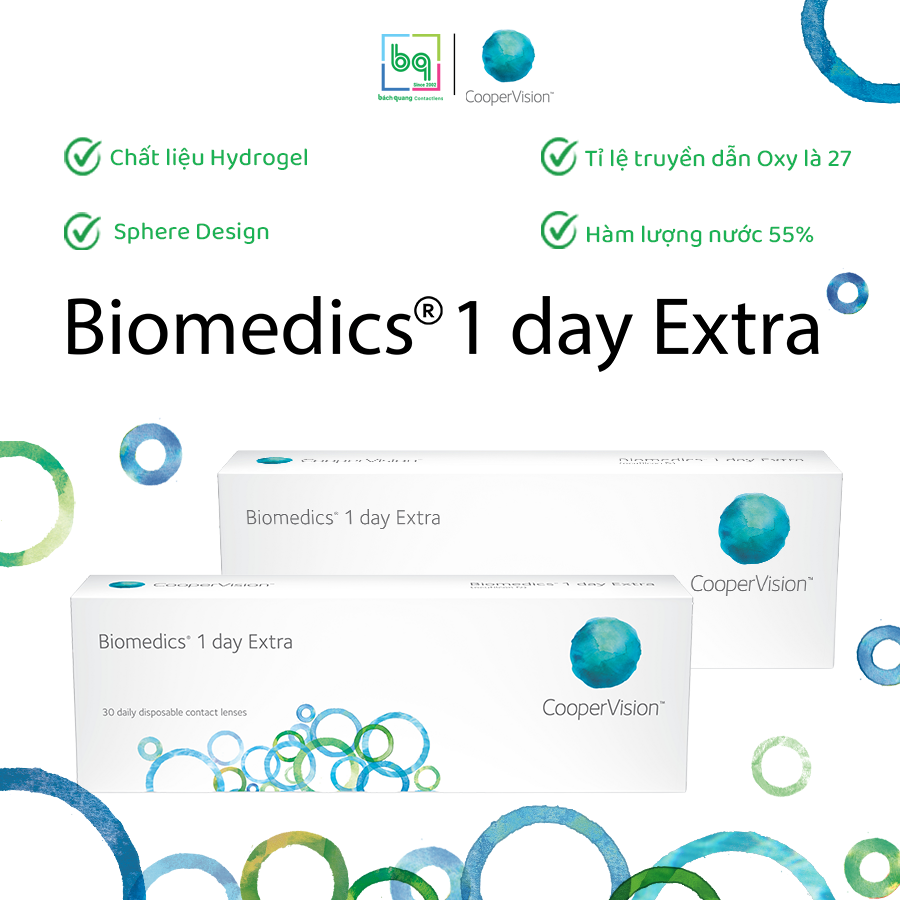 Kính áp tròng Biomedics 1day Extra được thiết kế và sản xuất bởi CooperVision(Mỹ), công ty hàng đầu trong thị trường kính áp tròng toàn cầu. Đây là loại kính áp tròng cận trong suốt dùng 1 ngày, mang lại sự thoải mái, an toàn cho người sử dụng.
