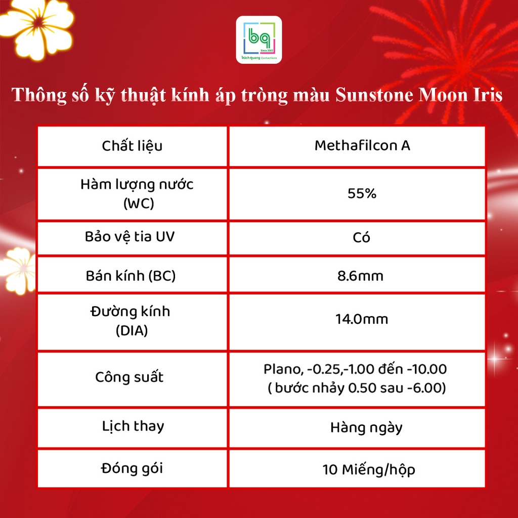 Với hàm lượng nước 55%, kính áp tròng Sunstone Moon Iris giúp giữ ẩm tốt, hạn chế cảm giác khô mắt khi sử dụng đúng cách.